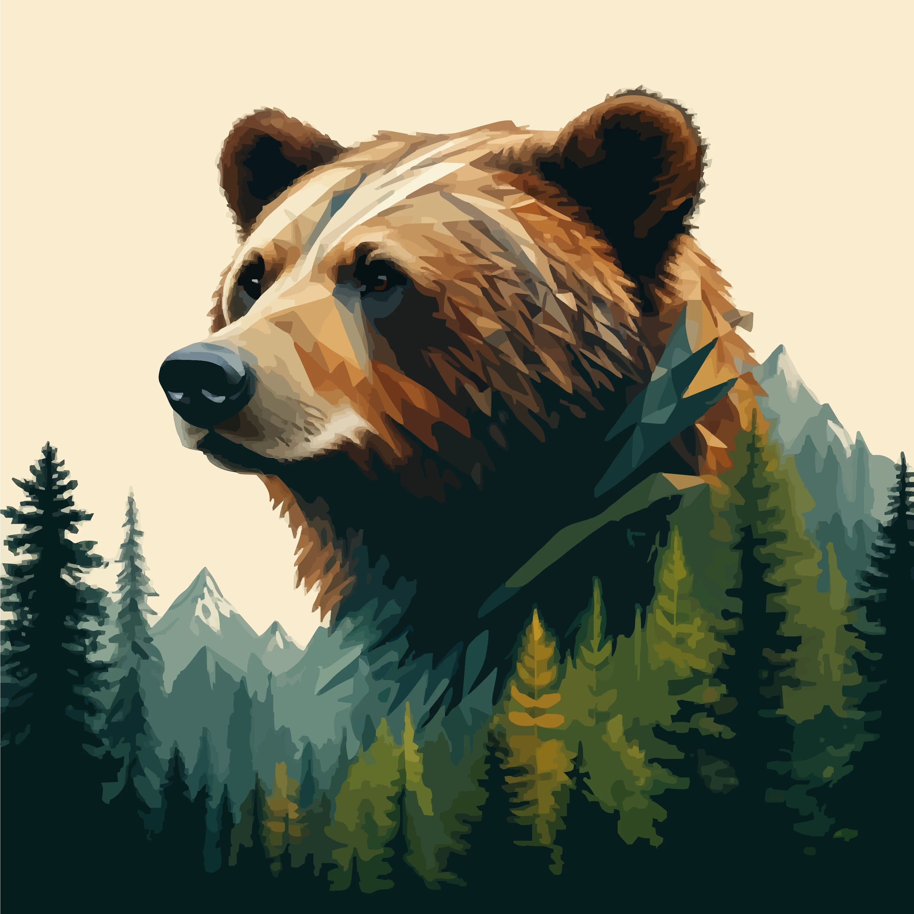Simple vector illustration of a bear standing in a forest clearing, minimal shapes and clean solid fills, rounded geometry, limited natural color palette, flat design with no gradients or textures, friendly illustrative style suitable for SVG output.